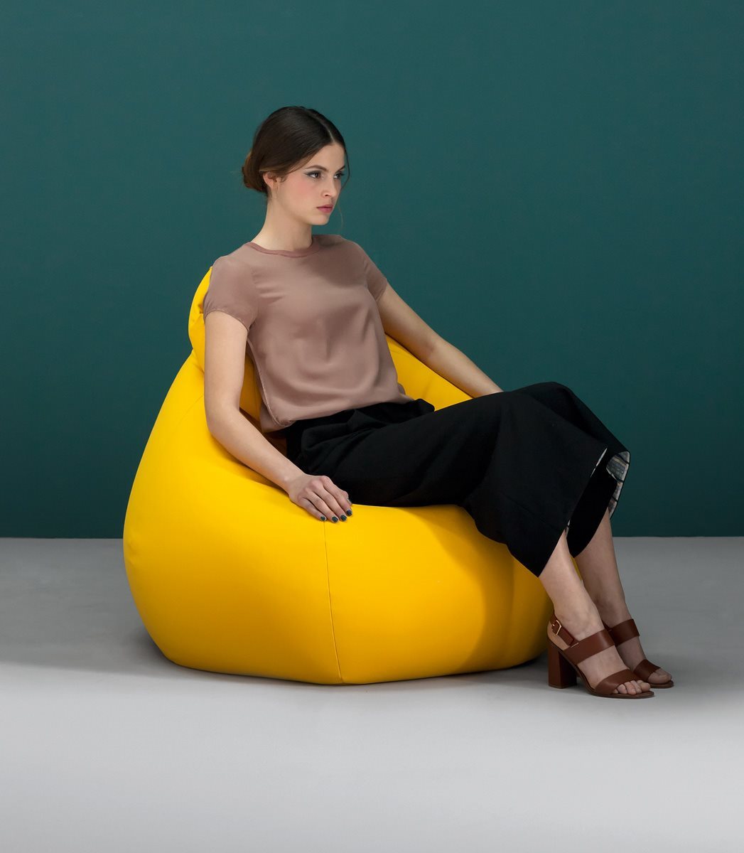 Anatomical easy chairs. Envelope containing highly resistant expanded polystyrene pellets. Cover in: fabric Tux, in Vip (also for outdoor, antibacterial and stainproof with Permablock 3® treatment) and leather.